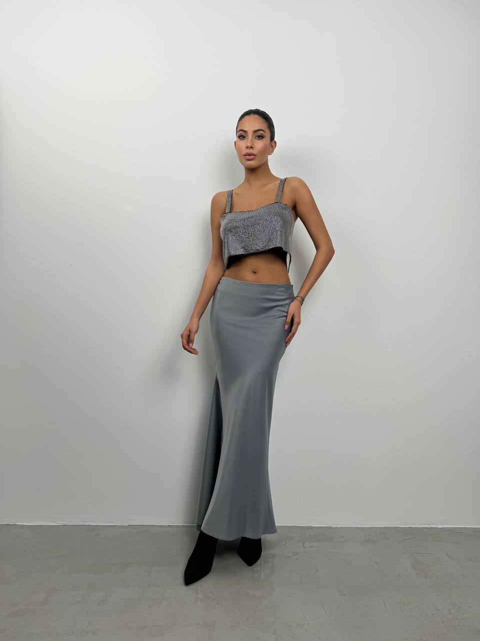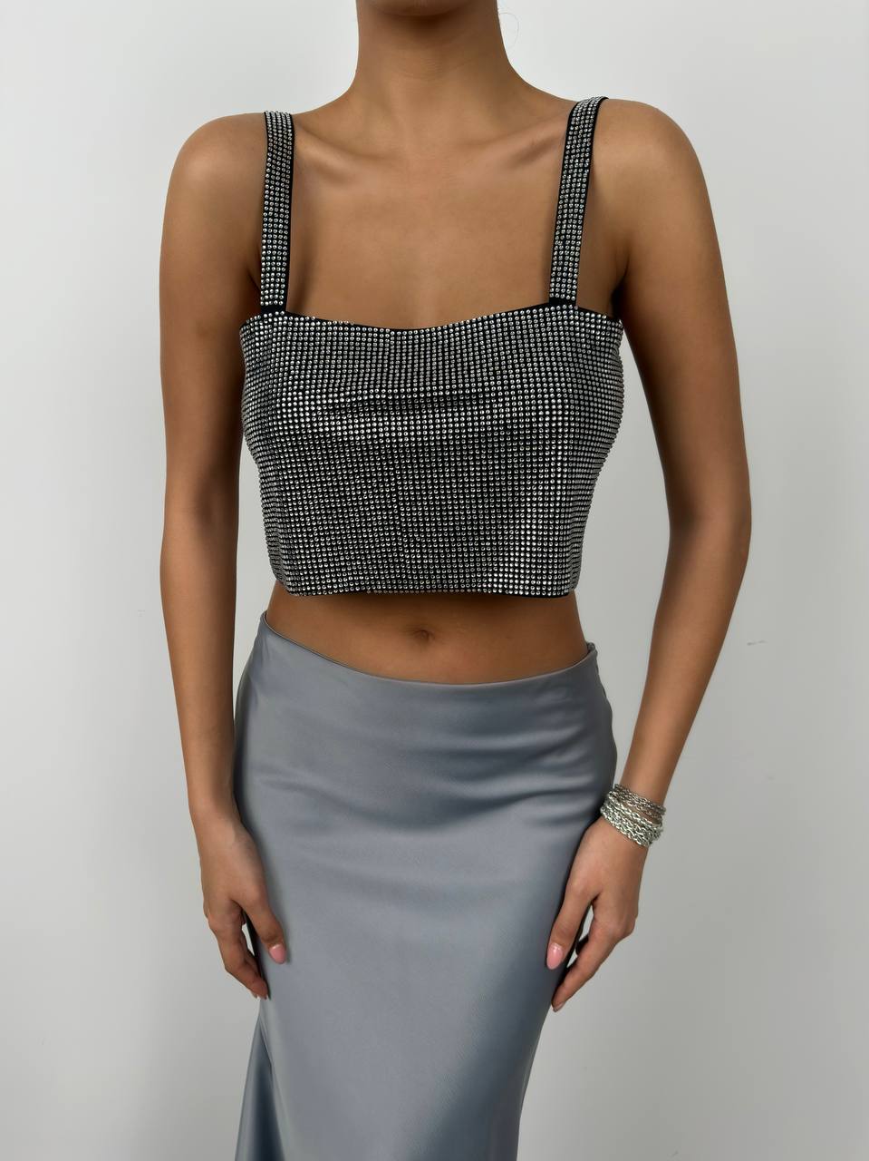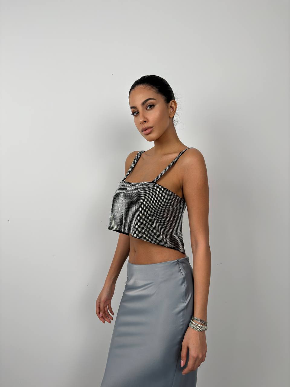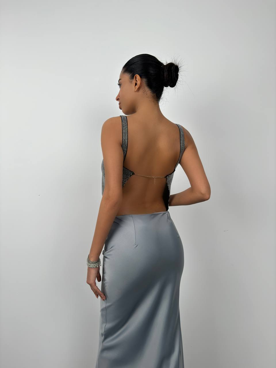 Kadın Degaje Yaka Taşlı Sırt Dekolteli Crop Bluz