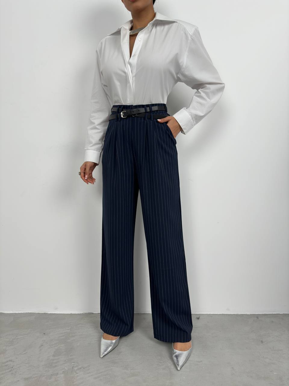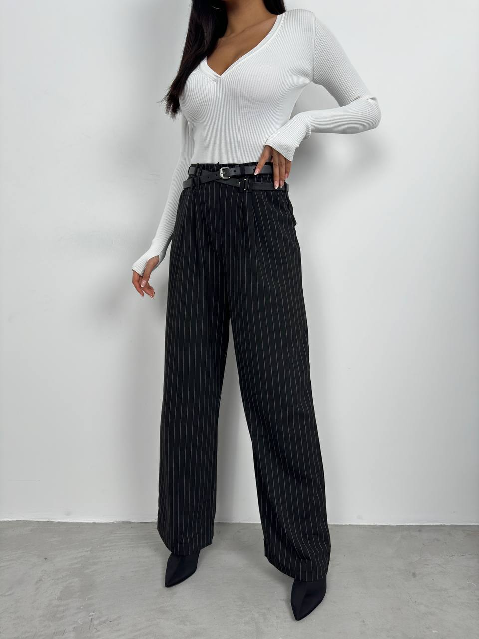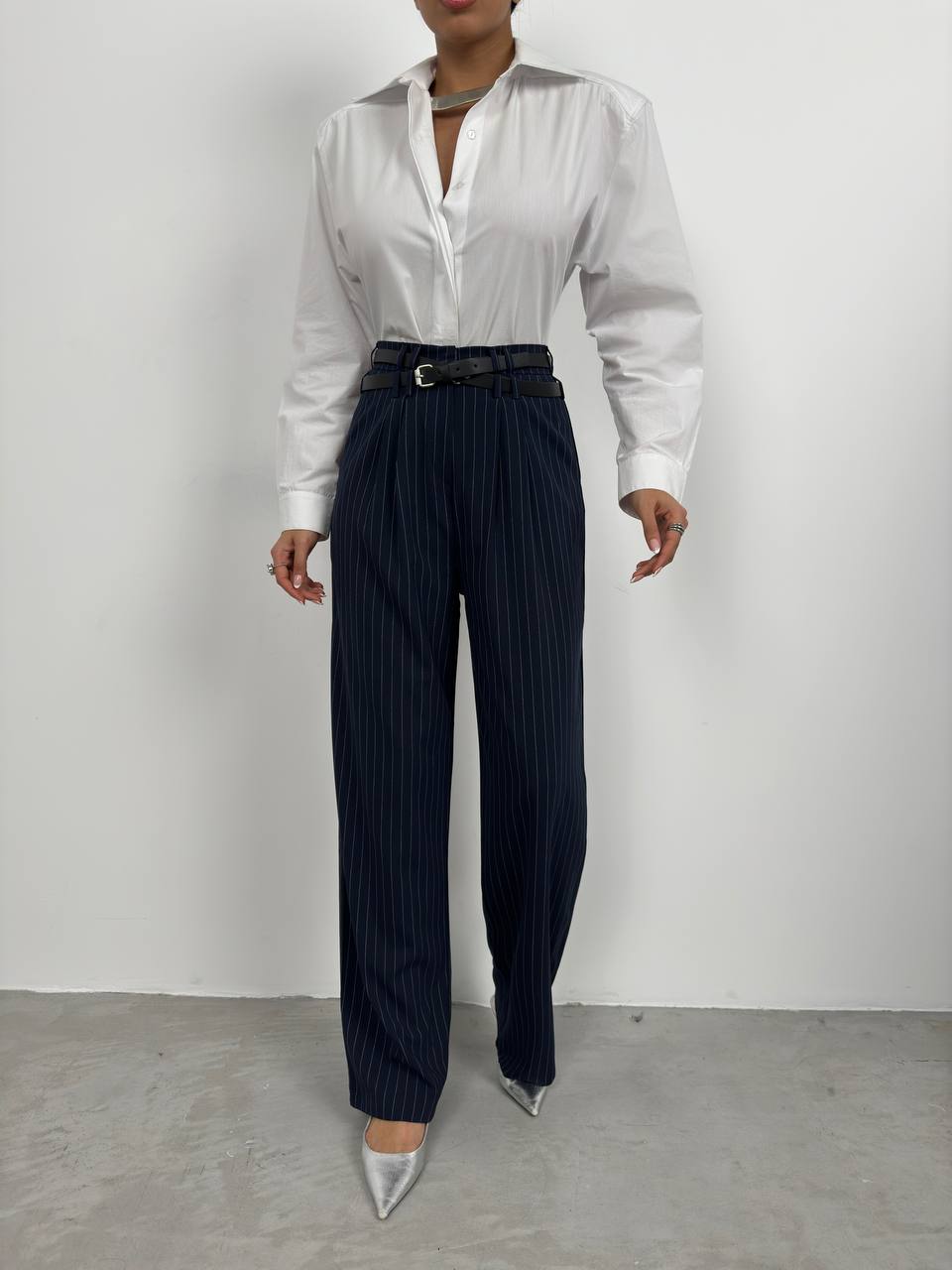 Kadın Kemer Detaylı Çizgili Casual Palazzo Pantolon