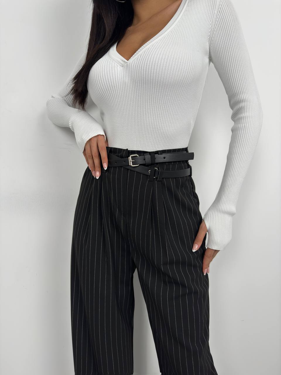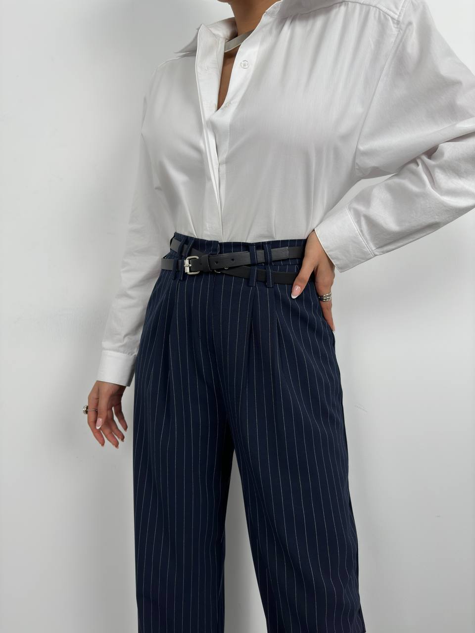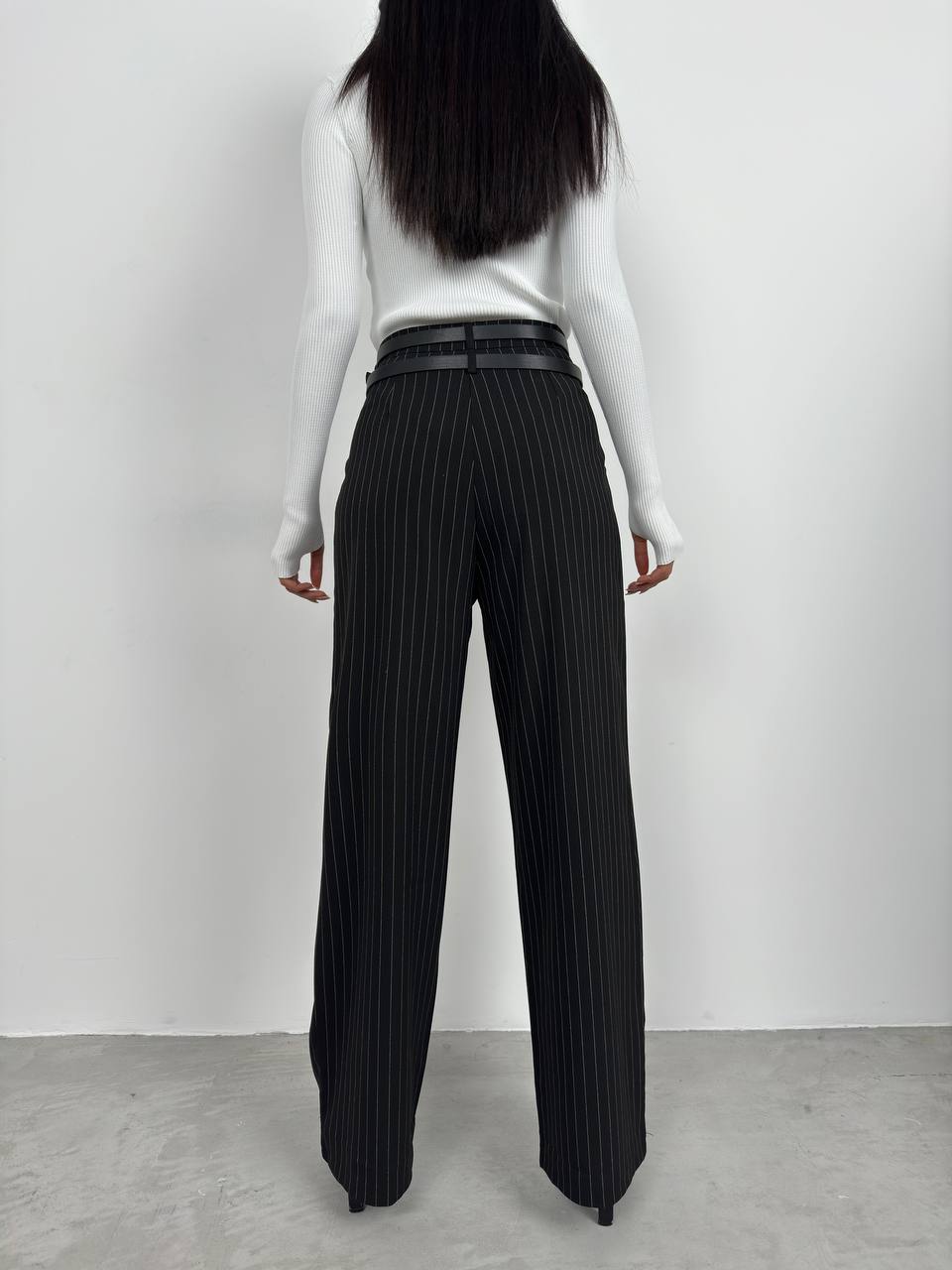 Kadın Kemer Detaylı Çizgili Casual Palazzo Pantolon