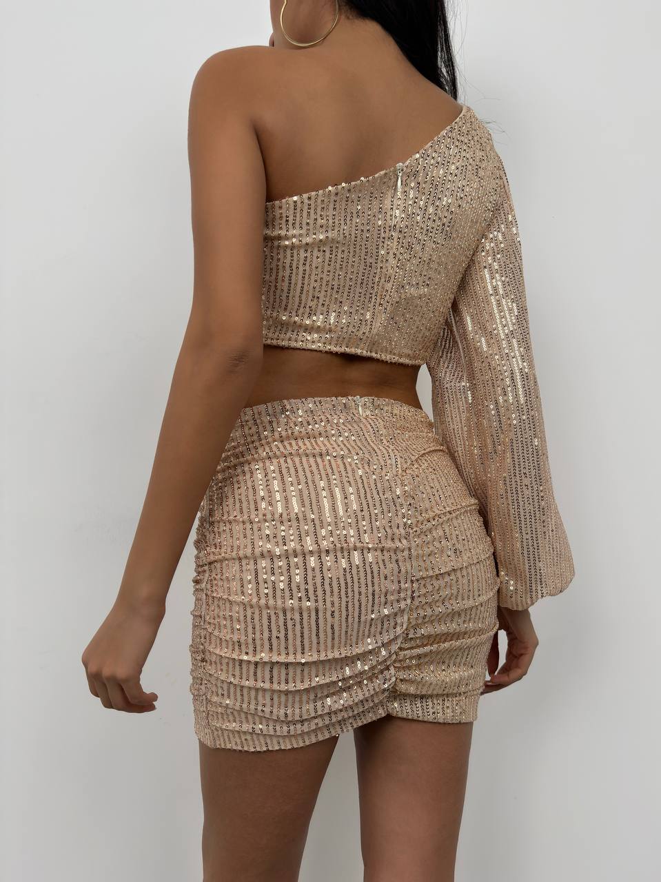 Kadın Payetli Tek Omuzlu Bluz Mini Etek Takım